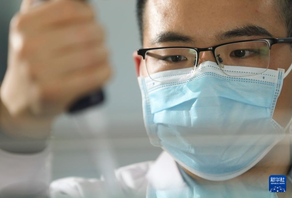 在重慶大學(xué)附屬三峽醫(yī)院分子病理中心實(shí)驗(yàn)室,印明柱教授團(tuán)隊(duì)成員在進(jìn)行血樣檢測(cè)(6月20日攝)。