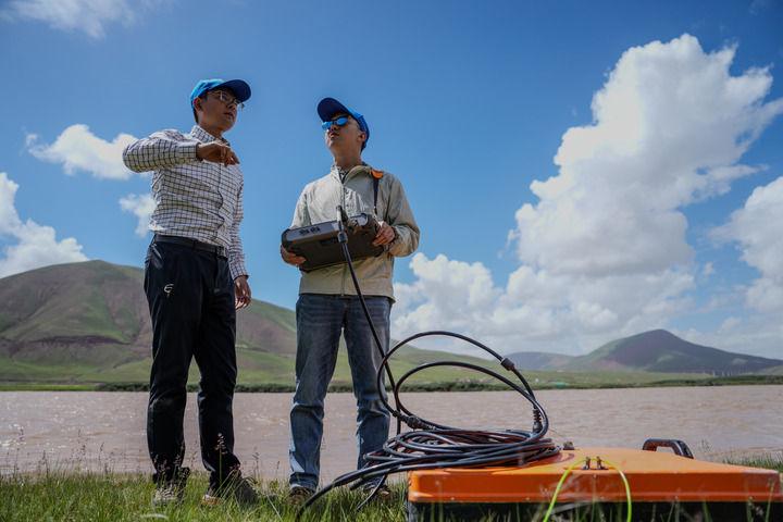 在長江南源當(dāng)曲源,科考隊員在進行流速測量(2024年7月22日攝)。新華社發(fā)(潘彬彬 攝)