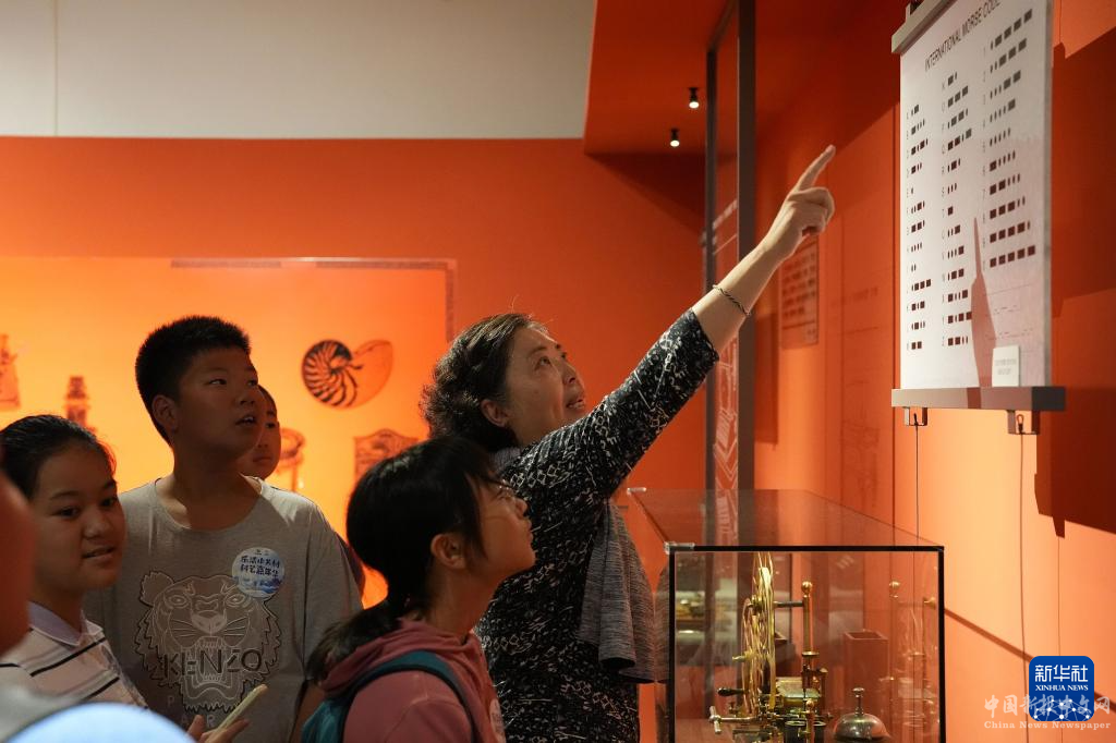 8月16日,在清華大學(xué)科學(xué)博物館,孩子們?cè)谥v解員帶領(lǐng)下參觀。