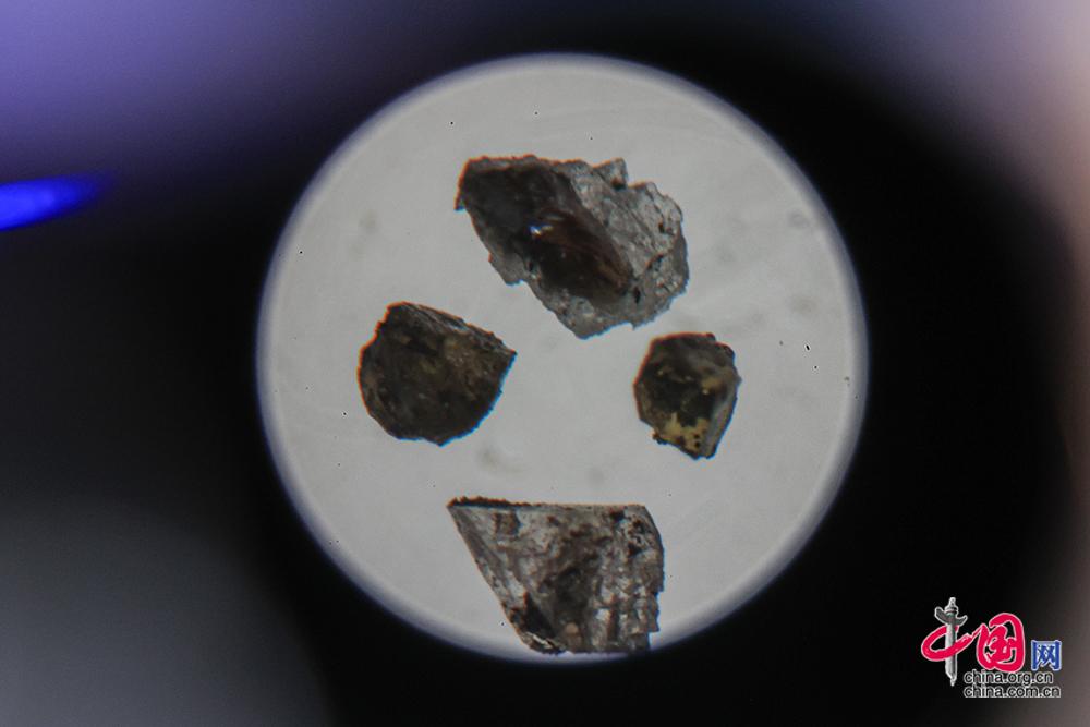 12月28日,“問月——中國探月工程嫦娥五號(hào)月球樣品展”在北京天文館B館一層展廳拉開帷幕。圖為顯微鏡下篩選自月球樣本的撞擊玻璃珠。中國網(wǎng)記者 倫曉璇 攝