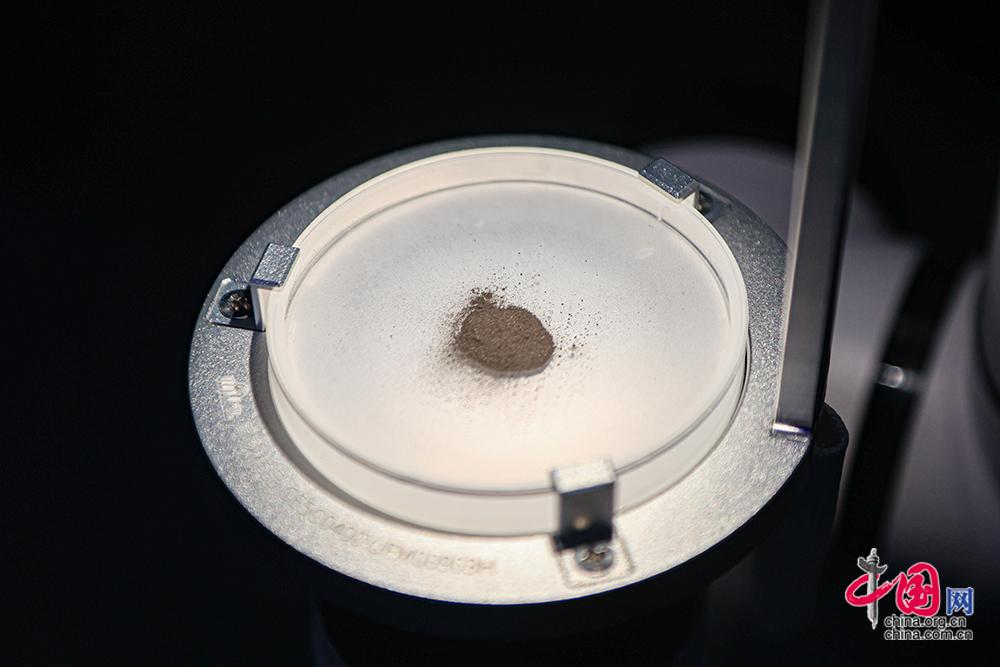 12月28日,“問月——中國探月工程嫦娥五號(hào)月球樣品展”在北京天文館B館一層展廳拉開帷幕。圖為模擬月壤。中國網(wǎng)記者 倫曉璇 攝