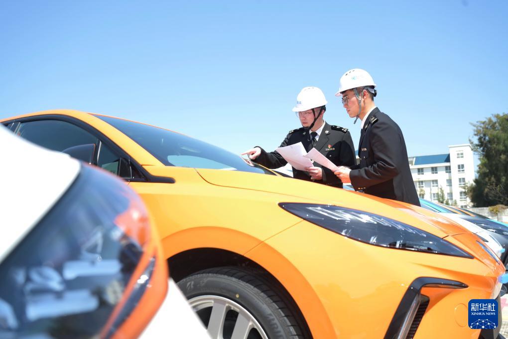 3月12日,福州海關(guān)關(guān)員林錚(左)、陳建洲(右)在福州港江陰港區(qū)的海關(guān)監(jiān)管區(qū)核對準備出口海外的車輛。