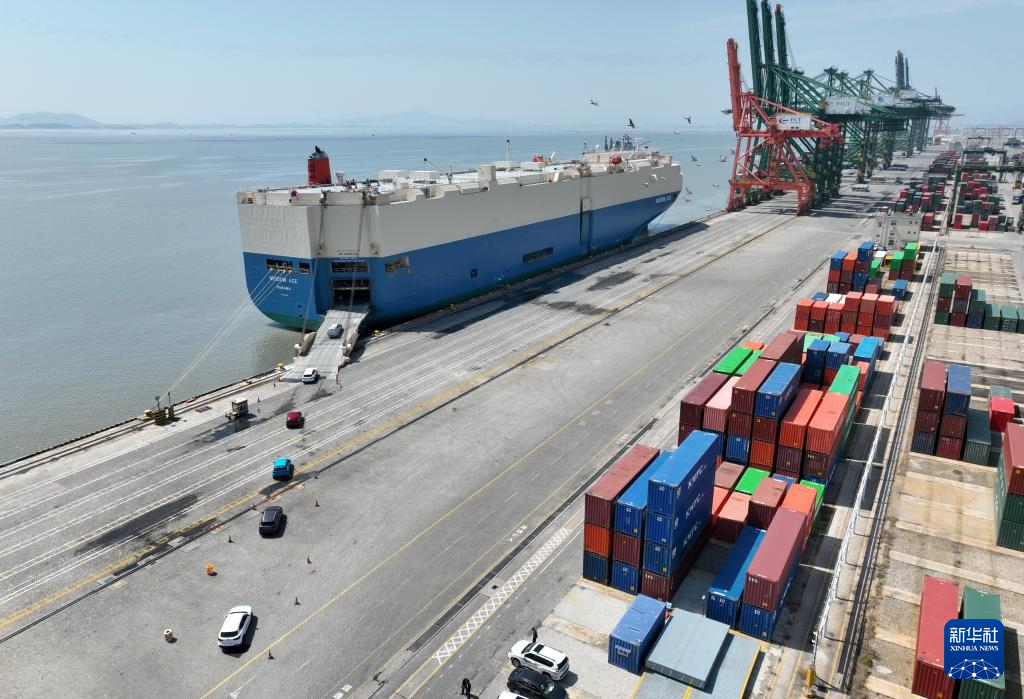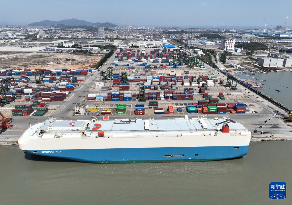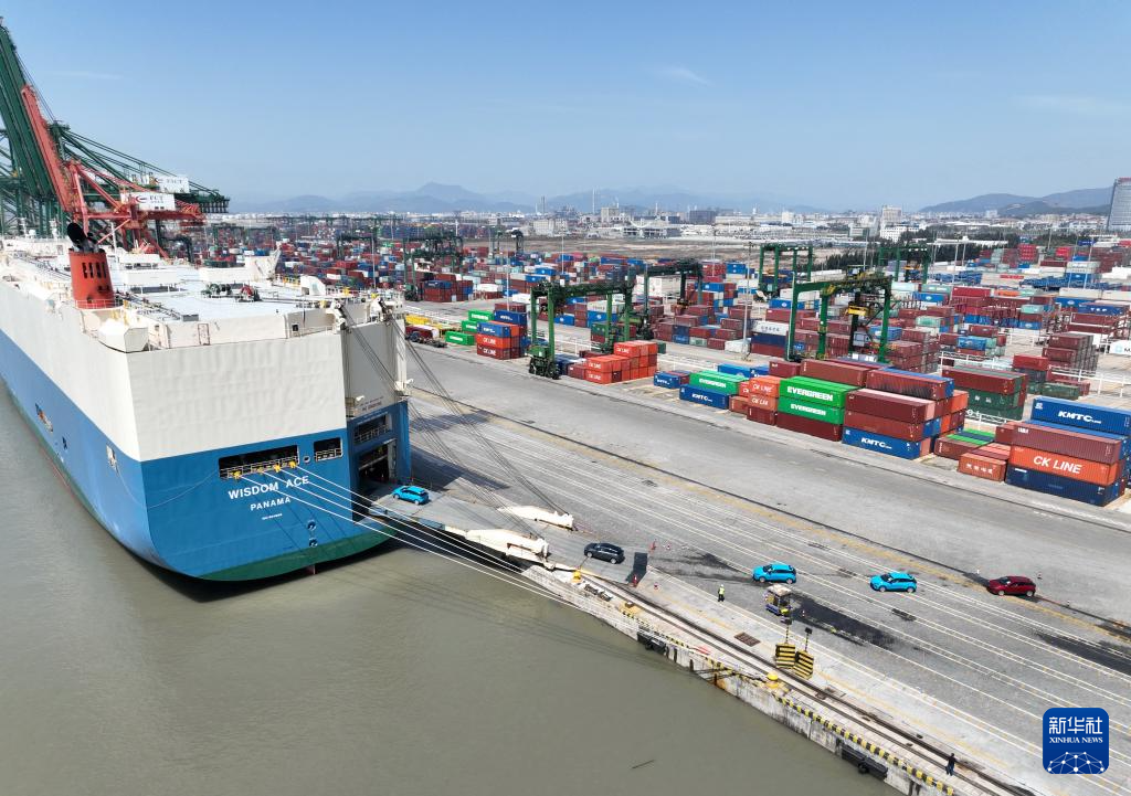 3月12日,上汽集團乘用車福建寧德基地生產(chǎn)的車輛從福州港江陰港區(qū)碼頭駛上遠洋滾裝輪。