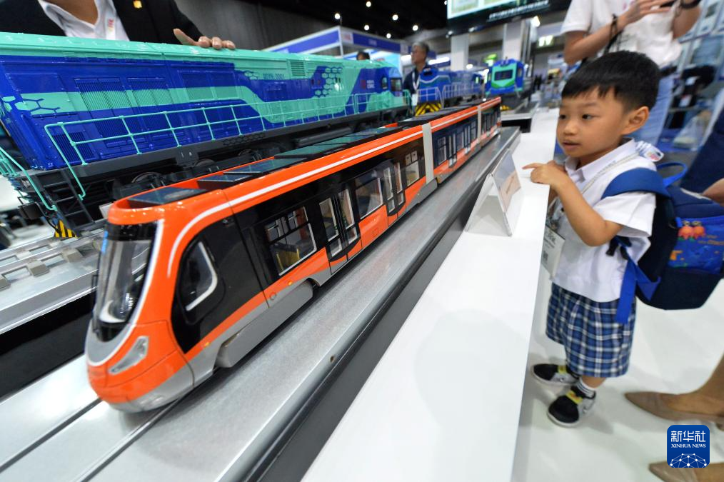 5月30日,在泰國曼谷舉辦的2024年亞太鐵路與軌道交通展覽會上,一名男孩參觀中車展臺的氫能源有軌電車模型。