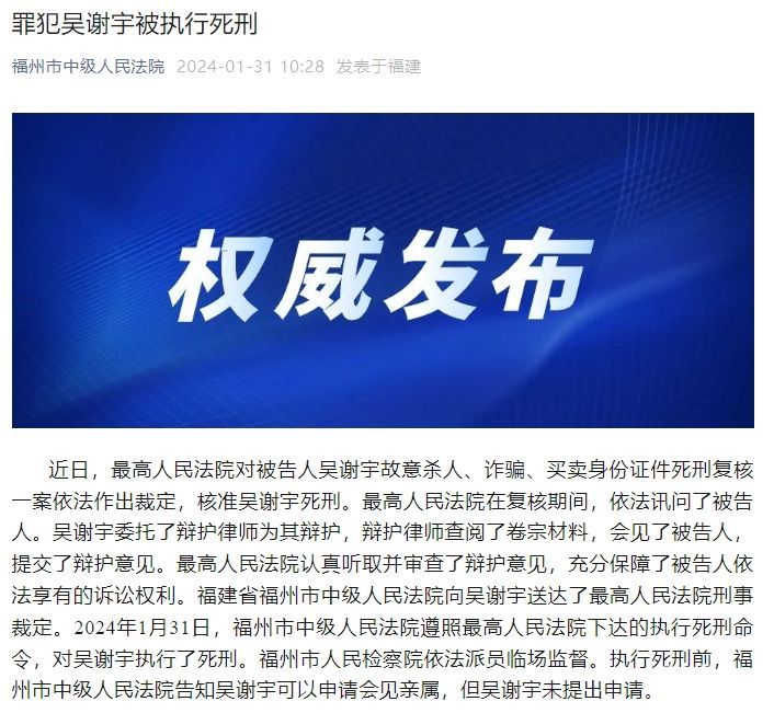 近日,最高人民法院對(duì)被告人吳謝宇故意殺人、詐騙、買賣身份證件死刑復(fù)核一案依法作出裁定,核準(zhǔn)吳謝宇死刑。最高人民法院在復(fù)核期間,依法訊問了被告人。吳謝宇委托了辯護(hù)律師為其辯護(hù),辯護(hù)律師查閱了卷宗材料,會(huì)見了被告人,提交了辯護(hù)意見。最高人民法院認(rèn)真聽取并審查了辯護(hù)意見,充分保障了被告人依法享有的訴訟權(quán)利。福建省福州市中級(jí)人民法院向吳謝宇送達(dá)了最高人民法院刑事裁定。2024年1月31日,福州市中級(jí)人民法院遵照最高人民法院下達(dá)的執(zhí)行死刑命令,對(duì)吳謝宇執(zhí)行了死刑。福州市人民檢察院依法派員臨場(chǎng)監(jiān)督。執(zhí)行死刑前,福州市中級(jí)人民法院告知吳謝宇可以申請(qǐng)會(huì)見親屬,但吳謝宇未提出申請(qǐng)。