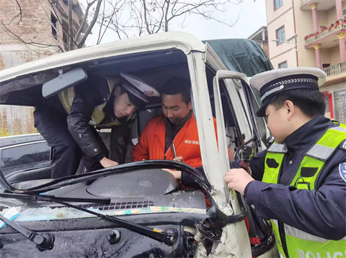 中國(guó)新報(bào)湖南訊(本報(bào)通訊員 曾慶屏 李貴日 王玉玨)“快、快,不能耽誤,去搶救事故司機(jī)……”2月4日上午10時(shí)許,藍(lán)山縣公安局交警大隊(duì)接到報(bào)警稱,在新圩鎮(zhèn)同樂(lè)村路段,兩輛輕型廂式貨車(chē)因?yàn)橛晏炻坊跁?huì)車(chē)時(shí)發(fā)生碰撞,一名司機(jī)被困駕駛室,急需救援。接到報(bào)警后,該大隊(duì)三中隊(duì)的民輔警立即趕赴現(xiàn)場(chǎng)進(jìn)行處置。