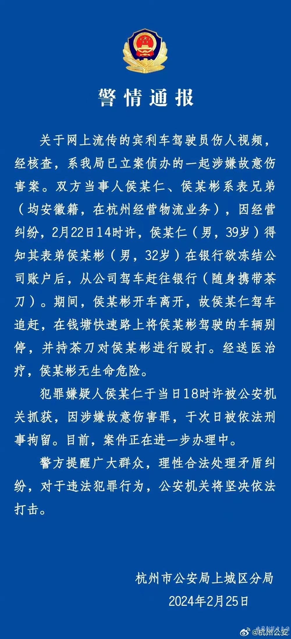 據(jù)杭州市公安局上城區(qū)分局通報,關于網上流傳的賓利車駕駛員傷人視頻,經核查,系該局已立案偵辦的一起涉嫌故意傷害案。雙方當事人侯某仁、侯某彬系表兄弟(均安徽籍,在杭州經營物流業(yè)務),因經營糾紛,2月22日14時許,侯某仁(男,39歲)得知其表弟侯某彬(男,32歲)在銀行欲凍結公司賬戶后,從公司駕車趕往銀行(隨身攜帶茶刀)。期間,侯某彬開車離開,故侯某仁駕車追趕,在錢塘快速路上將侯某彬駕駛的車輛別停,并持茶刀對侯某彬進行毆打。經送醫(yī)治療,侯某彬無生命危險。