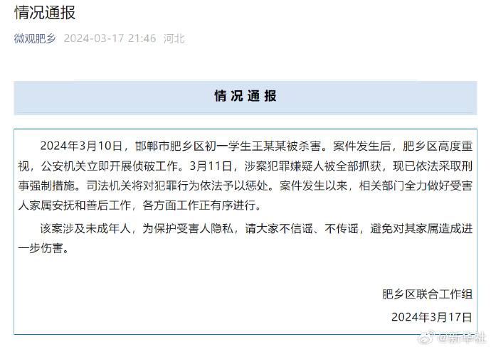 邯鄲市肥鄉(xiāng)區(qū)通報(bào)初中生被殺害案