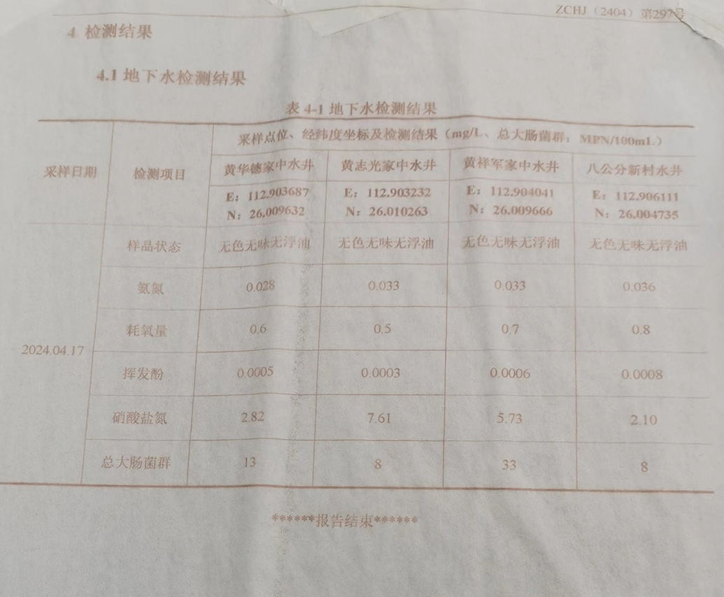 永興縣疾控中心最新的檢驗(yàn)報(bào)告顯示,八公分村的井水目前未檢出總大腸菌群。5月9日和10日,當(dāng)?shù)亟M織涉事企業(yè)與村民協(xié)商處理后續(xù)事宜。