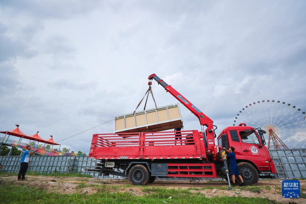5月15日,給短肢領航鯨“海棠”定制的運輸箱被吊送至三亞海昌生物保育中心的救助池附近。