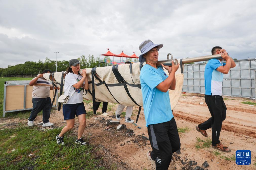 5月15日,藍絲帶海洋保護協(xié)會和三亞海昌生物保育中心的工作人員搬運運輸動物使用的擔架。