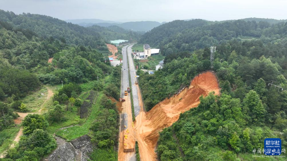 6月19日,工作人員駕駛機械在貴州省銅仁市萬山區(qū)黃道鄉(xiāng)黃溪村清理進村道路(無人機照片)。