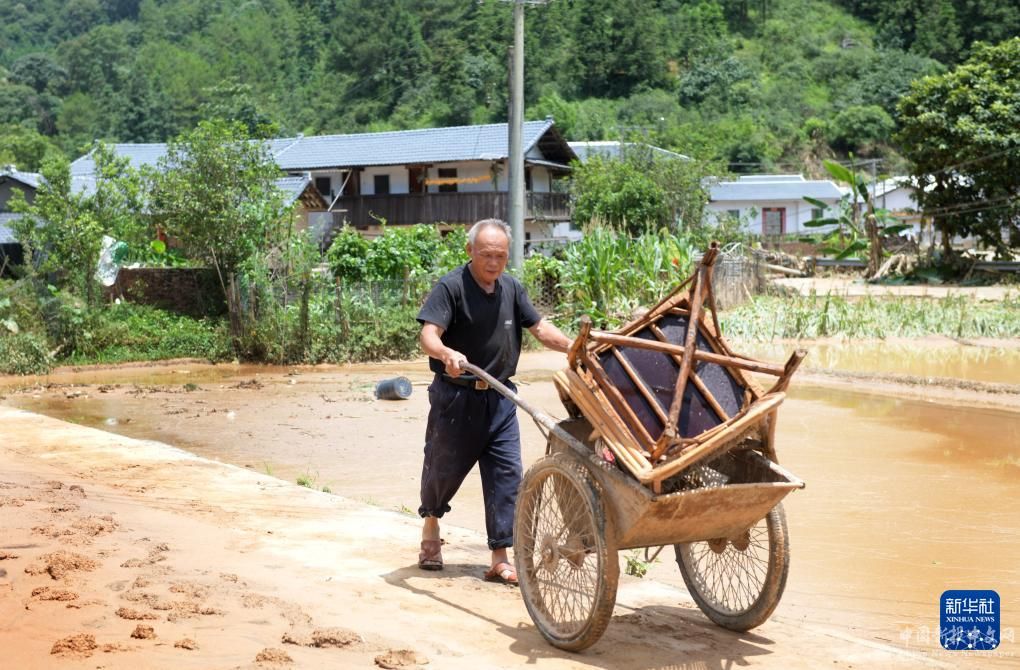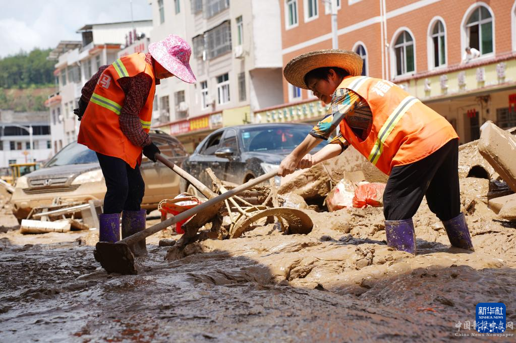 6月19日,志愿者和村民在貴州省遵義市播州區(qū)三合鎮(zhèn)馬坪村清理進村道路。