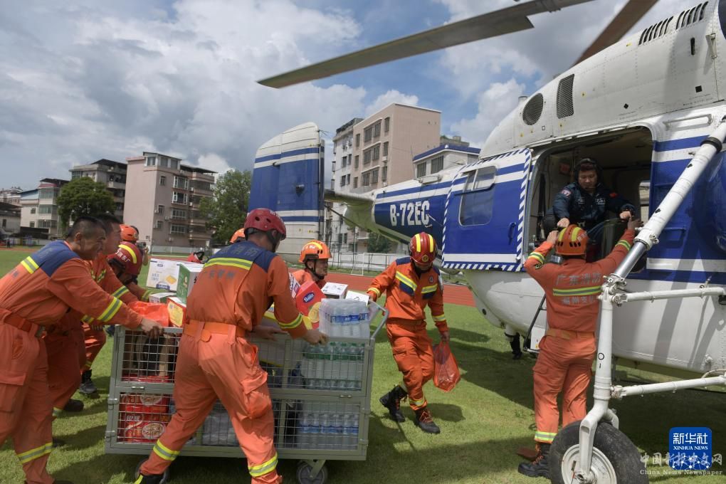 6月19日,救援人員在將救災物資搬上直升機,準備運往受災嚴重的廣東省梅州市平遠縣泗水鎮(zhèn)大新村,
