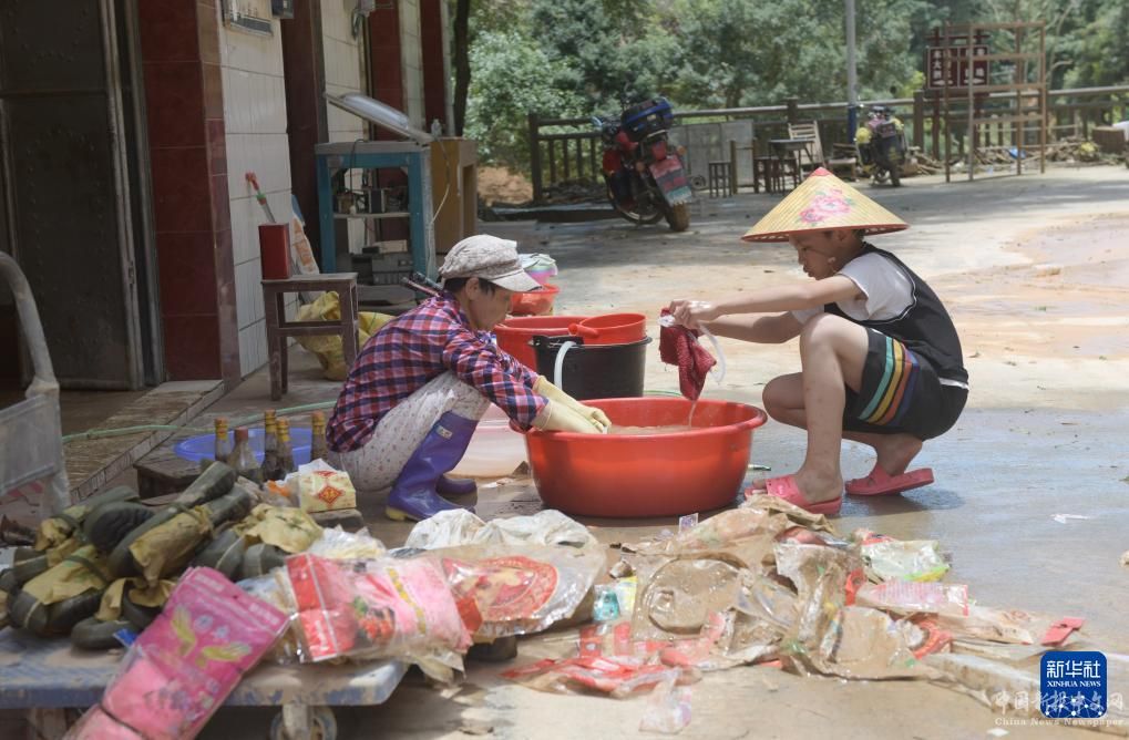 6月19日,在受災嚴重的廣東省梅州市平遠縣泗水鎮(zhèn)大新村,村民在清洗被洪水浸泡的物品。