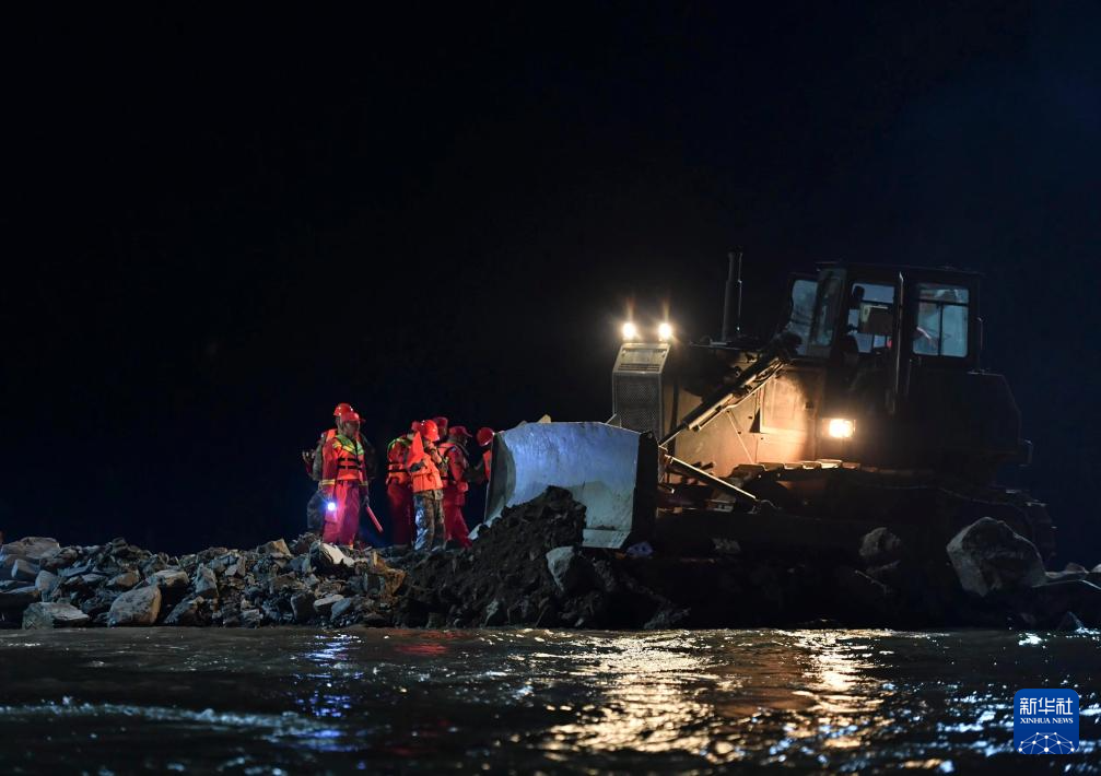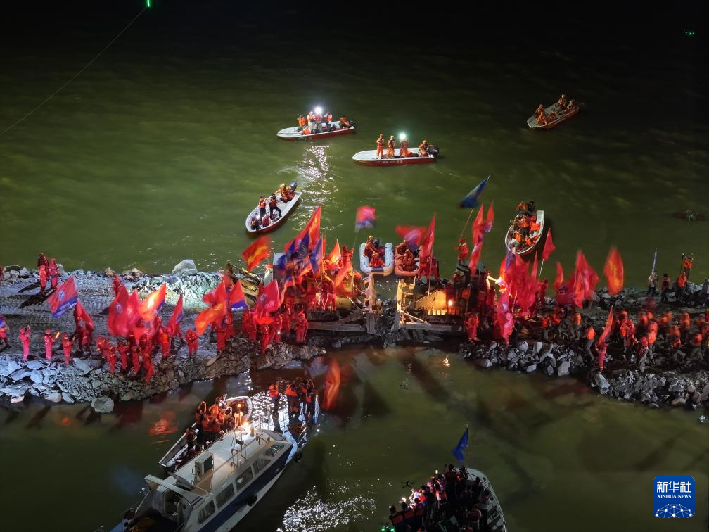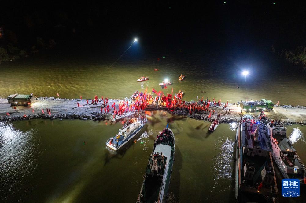 這是7月8日晚拍攝的團(tuán)洲垸洞庭湖大堤決口封堵現(xiàn)場(無人機(jī)照片)。