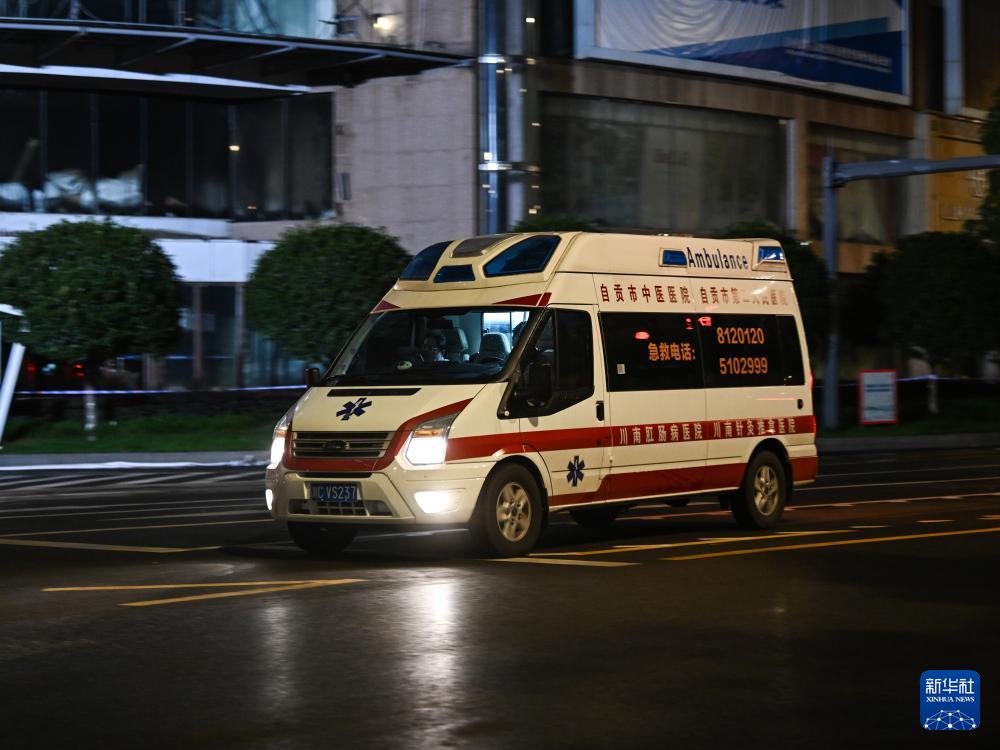 7月18日凌晨,救護(hù)車行駛在四川省自貢市高新區(qū)發(fā)生火災(zāi)的大樓附近。新華社記者 王曦 攝