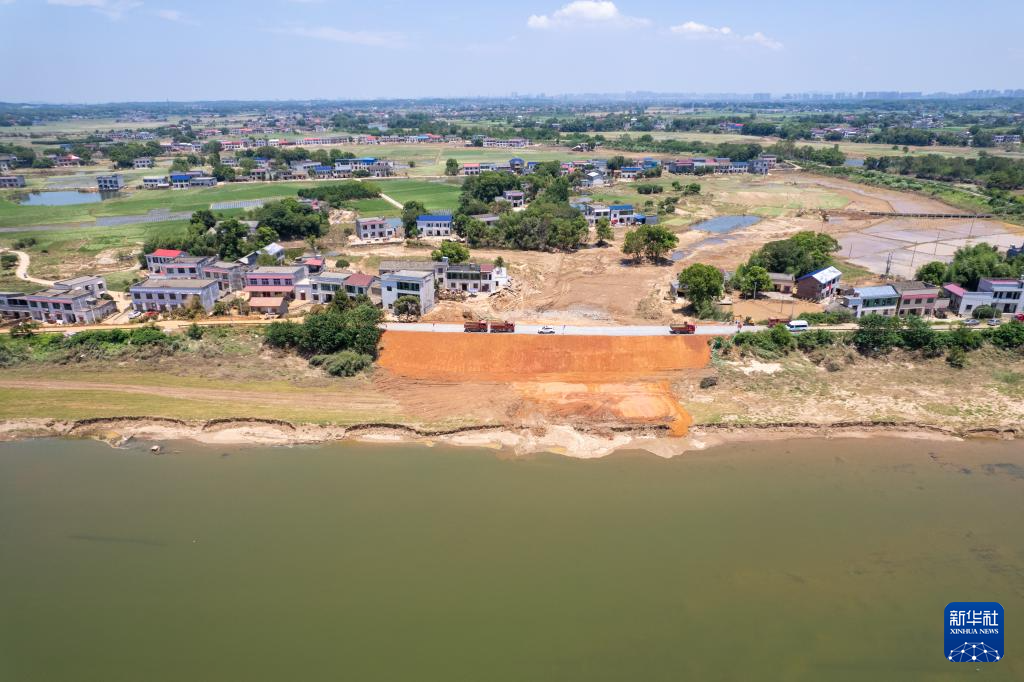 8月5日在湖南湘潭縣拍攝的涓水河口鎮(zhèn)華中村堤段修復(fù)完成現(xiàn)場(chǎng)(無(wú)人機(jī)照片)。