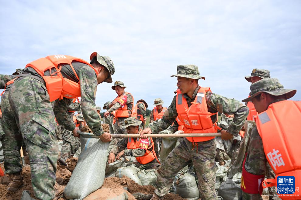 8月14日,搶險(xiǎn)人員在內(nèi)蒙古赤峰市老哈河堤防潰口現(xiàn)場(chǎng)裝填沙袋。