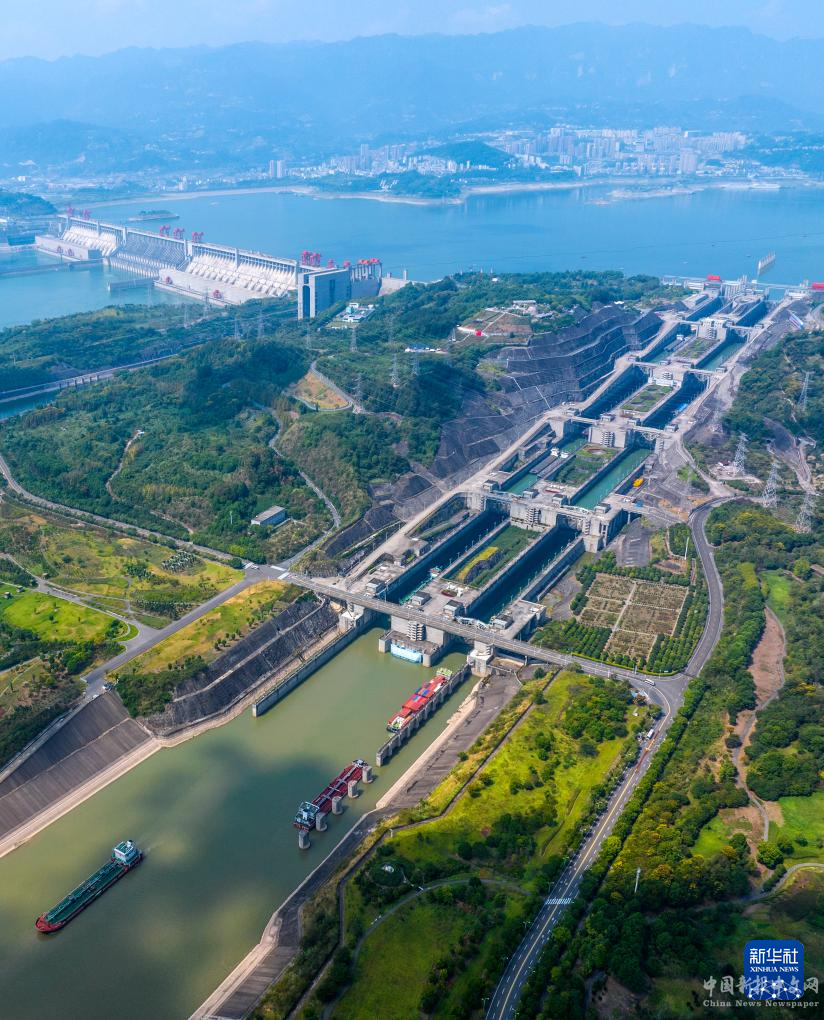 9月10日,在湖北省宜昌市,船舶有序通過(guò)三峽樞紐雙線五級(jí)船閘(無(wú)人機(jī)照片)。