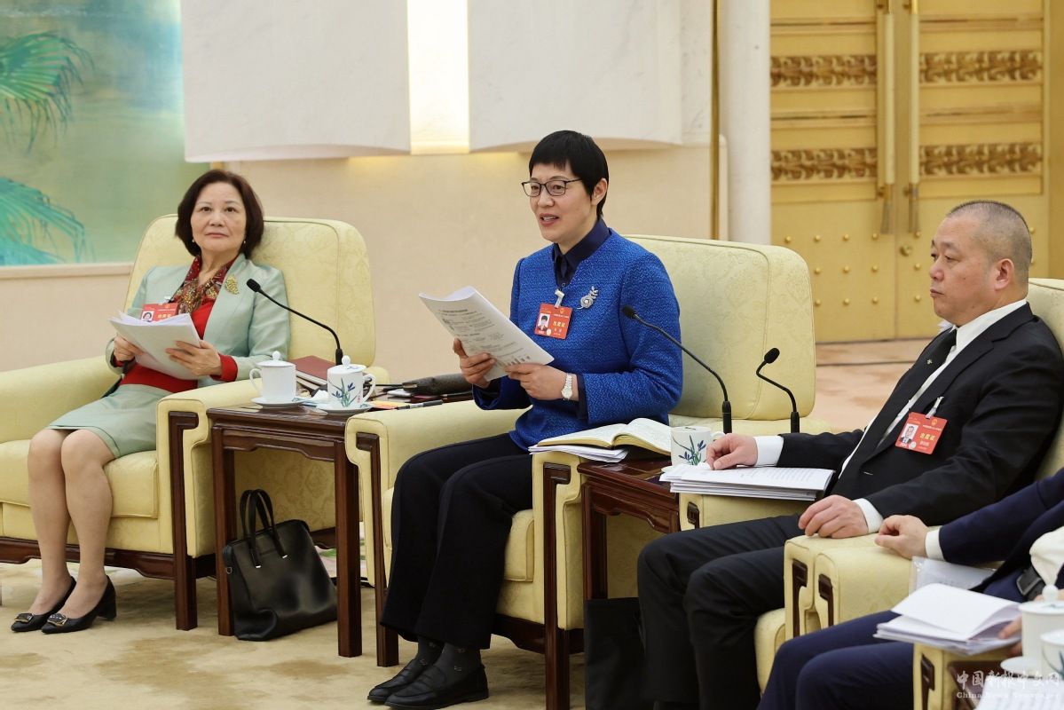 全國人大代表林青(中)在會議上發(fā)言。中國日報記者 王壯飛 攝