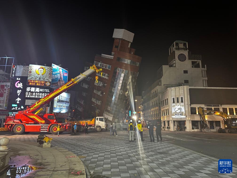 在位于地震震中附近的花蓮,搜救工作還在連夜進(jìn)行。圖為發(fā)生嚴(yán)重傾倒的天王星大樓。新華社發(fā)