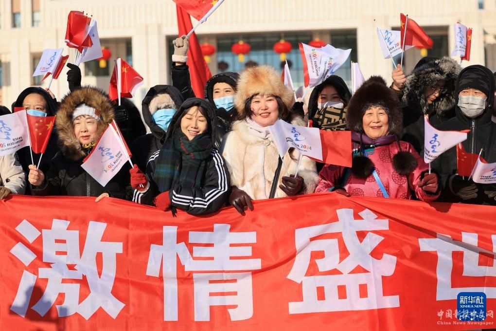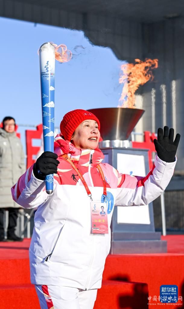 2月3日,在內(nèi)蒙古呼倫貝爾市滿洲里國(guó)門景區(qū),第一棒火炬手王桂芳在火炬?zhèn)鬟f活動(dòng)中。