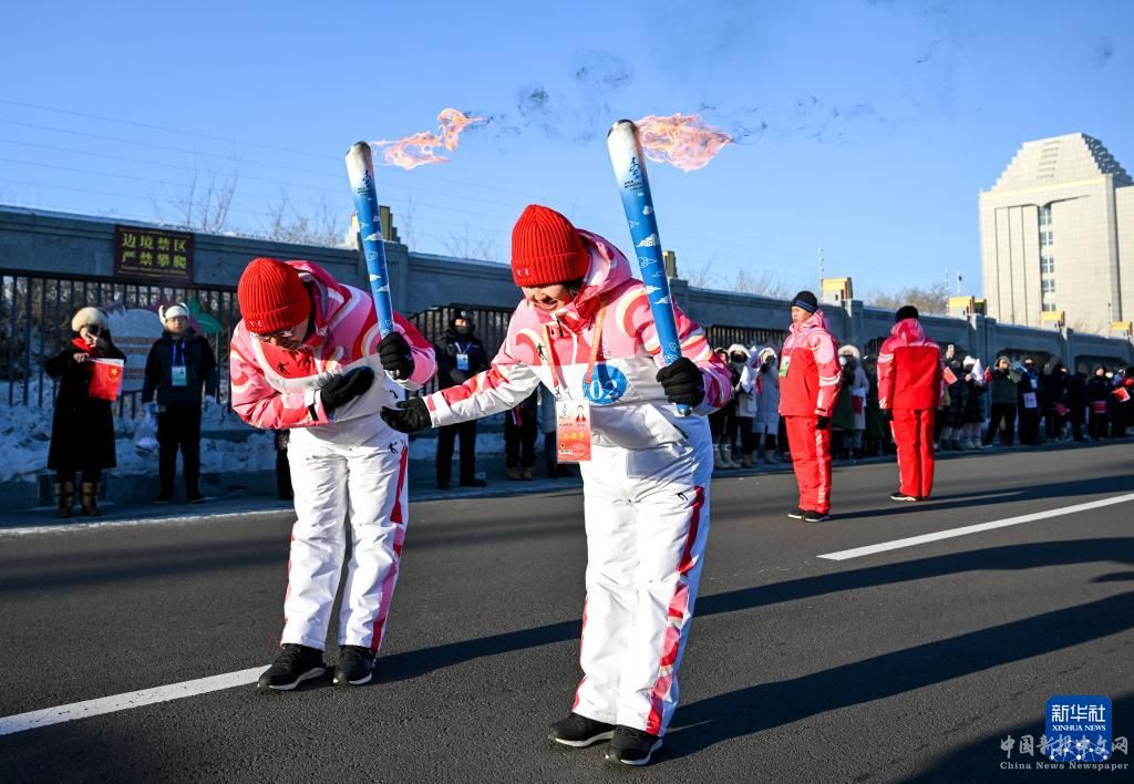 2月3日,在內(nèi)蒙古呼倫貝爾市滿洲里國(guó)門景區(qū),火炬手包玲玲(右)和錢卓在火炬?zhèn)鬟f活動(dòng)中。