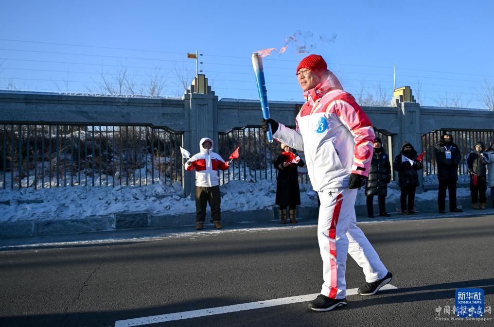 2月3日,火炬手宋桂旭在火炬?zhèn)鬟f活動(dòng)中。