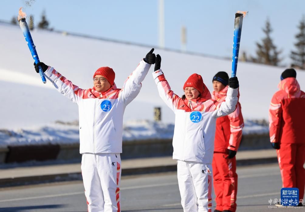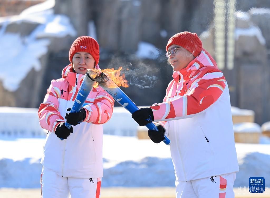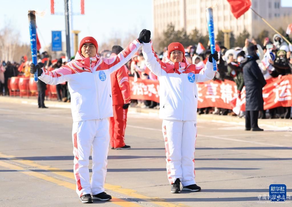 2月3日,火炬手景曉濤(右)、烏蘭托婭在火炬?zhèn)鬟f活動(dòng)中。