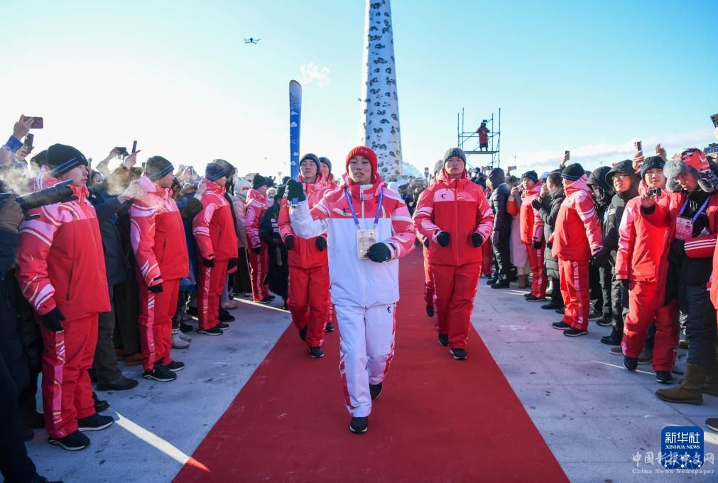 2月3日,火炬手鄭璐在火炬?zhèn)鬟f活動(dòng)中。
