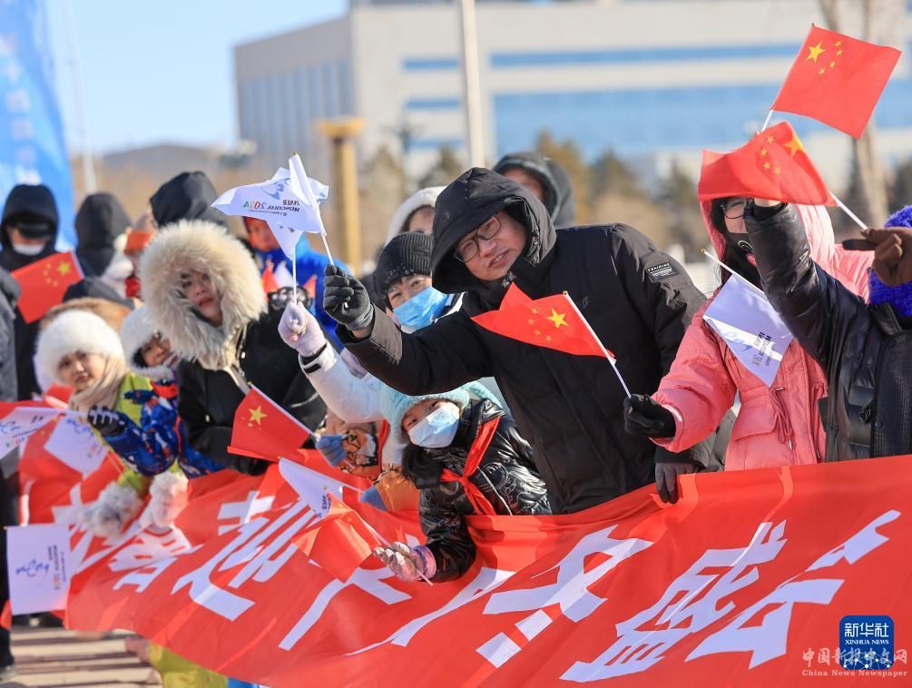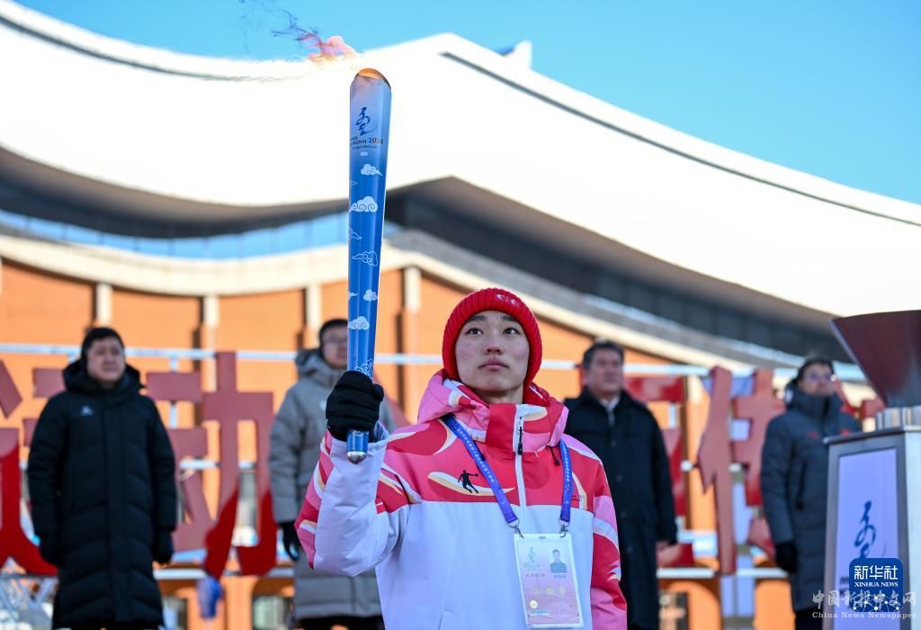2月3日,在內(nèi)蒙古呼倫貝爾市滿洲里國(guó)門景區(qū),火炬手錢卓在火炬?zhèn)鬟f活動(dòng)中。