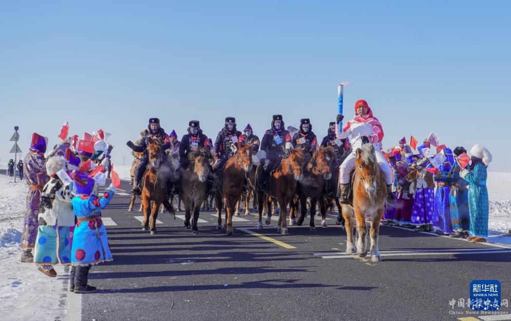 2月3日,火炬手米吉格道爾吉在火炬?zhèn)鬟f活動(dòng)中騎馬傳遞火炬。