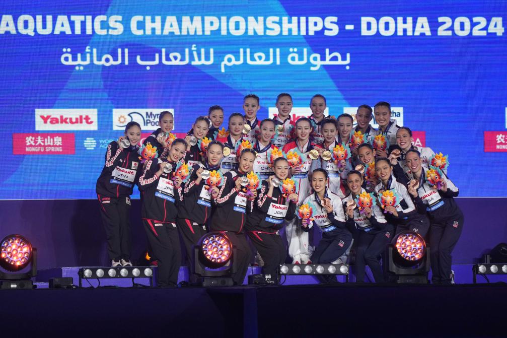 2月9日,冠軍中國隊(duì)(中)、亞軍日本隊(duì)(左)和季軍美國隊(duì)在頒獎(jiǎng)儀式上。當(dāng)日,在卡塔爾多哈舉行的2024年世界游泳錦標(biāo)賽花樣游泳集體自由自選決賽中,中國隊(duì)奪得冠軍。新華社記者 薛宇舸 攝