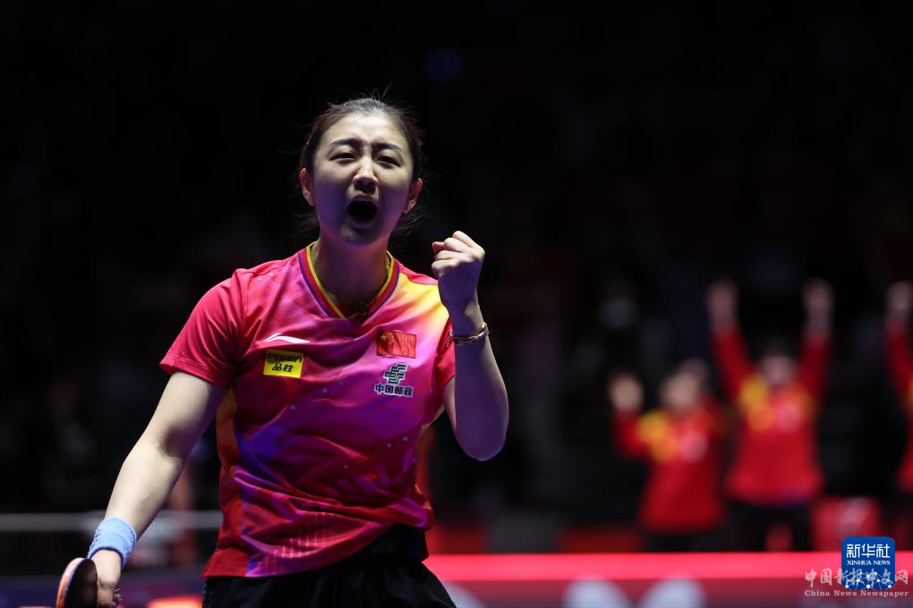2月24日,中國(guó)隊(duì)選手陳夢(mèng)慶祝第五盤(pán)比賽獲勝。最終,她3比1戰(zhàn)勝日本隊(duì)選手張本美和。