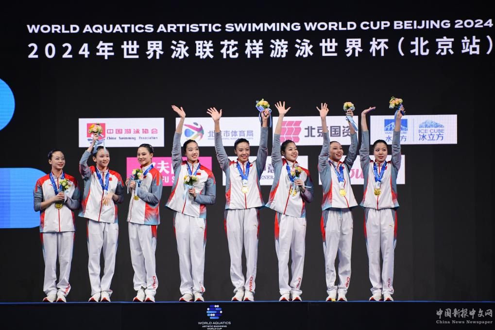 4月5日,冠軍中國(guó)隊(duì)在頒獎(jiǎng)儀式上。當(dāng)日,在2024年花樣游泳世界杯(北京站)集體技術(shù)自選比賽中,中國(guó)隊(duì)以250.2686分的成績(jī)奪得冠軍,澳大利亞隊(duì)以229.1117分的成績(jī)獲得亞軍,哈薩克斯坦隊(duì)以208.6020分的成績(jī)獲得季軍。新華社記者 鞠煥宗 攝