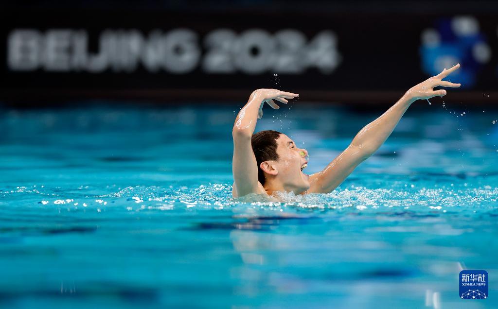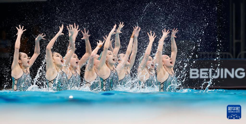 4月6日,中國(guó)隊(duì)在比賽中。當(dāng)日,在2024年花樣游泳世界杯(北京站)集體自由自選比賽中,中國(guó)隊(duì)以343.3479分的成績(jī)獲得冠軍。新華社記者 王麗莉 攝