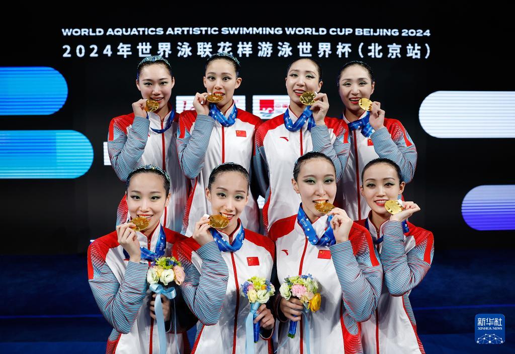 4月6日,冠軍中國(guó)隊(duì)在頒獎(jiǎng)儀式后合影。當(dāng)日,在2024年花樣游泳世界杯(北京站)集體自由自選比賽中,中國(guó)隊(duì)以343.3479分的成績(jī)獲得冠軍。新華社記者 王麗莉 攝