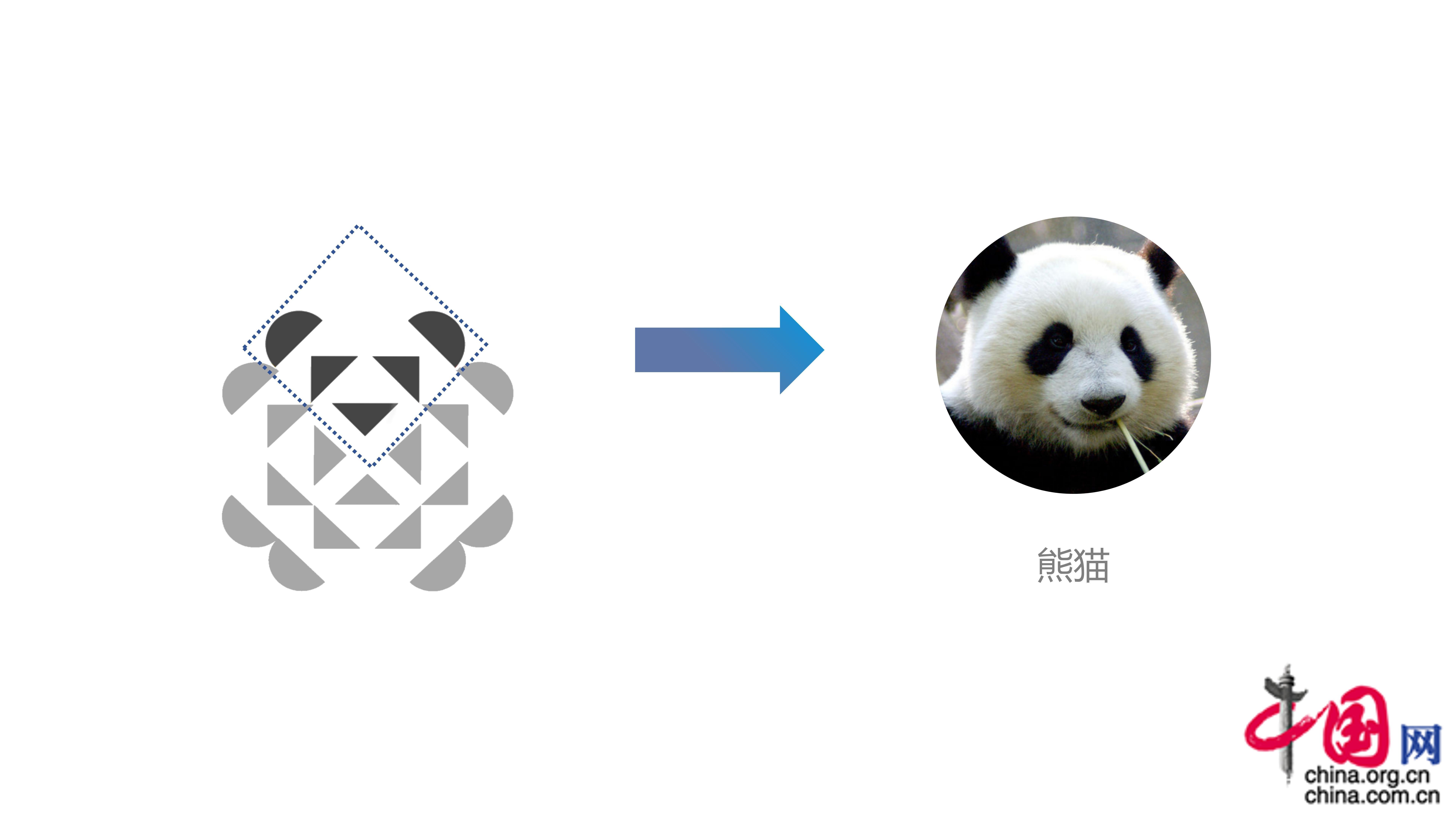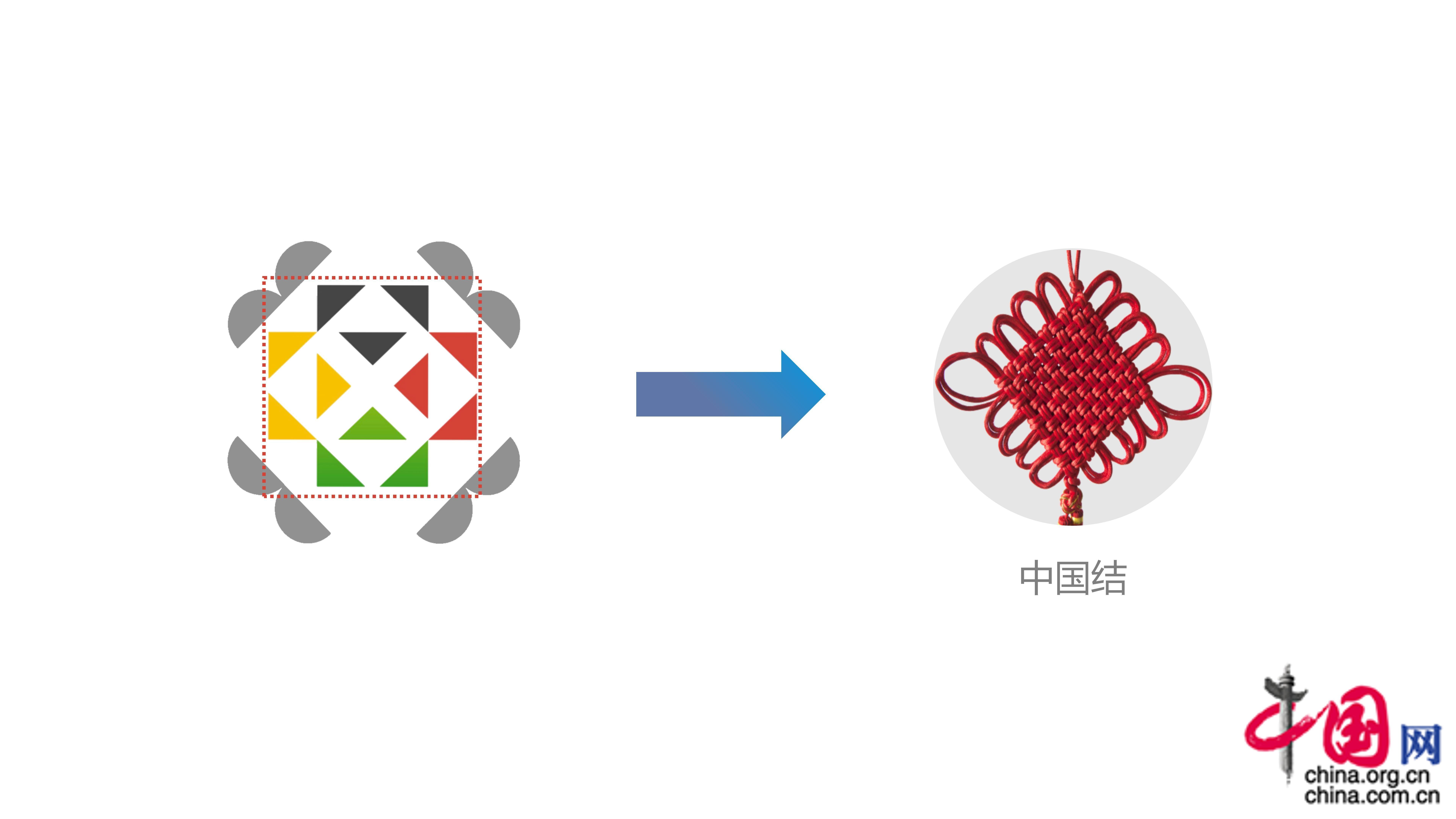 “會(huì)徽的構(gòu)圖參考了中國(guó)結(jié)的形狀,這種古老的手工編織工藝品簡(jiǎn)潔而優(yōu)美,象征著團(tuán)結(jié)、繁榮和幸運(yùn),它能變化出多種形態(tài),仿佛繩結(jié)編成的魔方,非常令我著迷。”費(fèi)爾利說,“圖案中的半圓模擬大熊貓的耳朵,同時(shí)也可視為幾何形態(tài)的芙蓉花瓣。會(huì)徽上下左右四個(gè)對(duì)稱部分中,每一個(gè)都‘藏’著大熊貓的面部特征。”