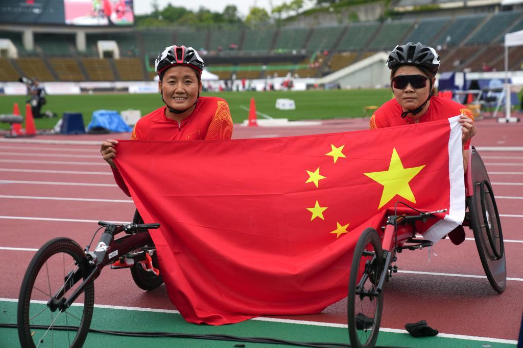 5月22日,中國(guó)選手周洪轉(zhuǎn)(左)和隊(duì)友高芳在女子100米T53級(jí)別決賽后合影。新華社記者 張笑宇 攝