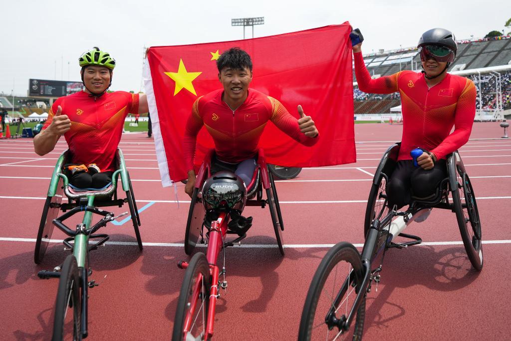 5月22日,中國(guó)選手代云強(qiáng)、金華和羅興傳(從左至右)在男子1500米T54級(jí)別決賽后合影。新華社記者 張笑宇 攝