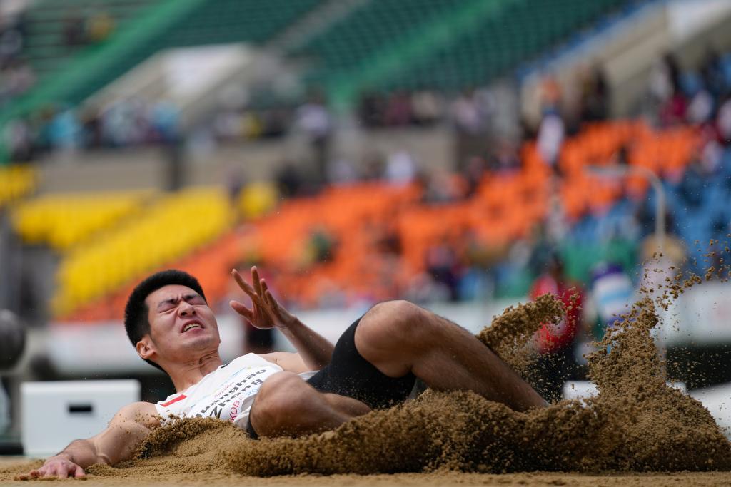 5月22日,中國(guó)選手衷黃浩在男子跳遠(yuǎn)T38級(jí)別決賽中。新華社記者 張笑宇 攝