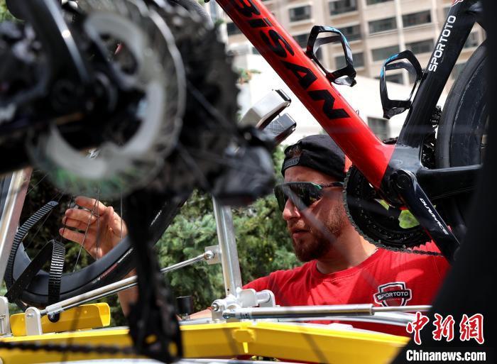 2024第二十三屆環(huán)青海湖國際公路自行車賽7月7日在青海省西寧市打響揭幕戰(zhàn),車隊機械師為比賽用車做最后檢查。2024“中國工商銀行杯”第二十三屆環(huán)湖賽第一賽段西寧繞圈賽,比賽距離121公里(13.4公里/圈*9圈)共設(shè)三個途中沖刺點(第3、5、7圈)。兩個四級爬坡(24.7km處、51.5km處)。獲得本賽段前三名的是:第一名來自比利時歐倍青-德科尼克車隊的14號延森-普羅萊特(PLOWRIGHT Jensen),第二名來自意大利巴迪亞尼車隊67號恩里科-扎農(nóng)切洛(ZANONCELLO Enrico),第三名來自荷蘭帕克赫特爾車隊102號杰斯泊(RASCH Jesper )。中新社記者 薛蒂 攝