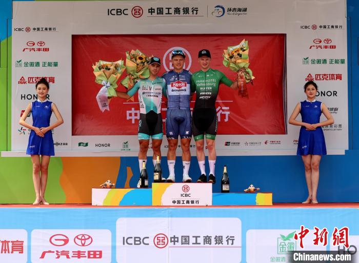 2024第二十三屆環(huán)青海湖國際公路自行車賽7月7日在青海省西寧市打響揭幕戰(zhàn),本賽段前三名車手合影留念。2024“中國工商銀行杯”第二十三屆環(huán)湖賽第一賽段西寧繞圈賽,比賽距離121公里(13.4公里/圈*9圈)共設(shè)三個途中沖刺點(第3、5、7圈)。兩個四級爬坡(24.7km處、51.5km處)。獲得本賽段前三名的是:第一名來自比利時歐倍青-德科尼克車隊的14號延森-普羅萊特(PLOWRIGHT Jensen),第二名來自意大利巴迪亞尼車隊67號恩里科-扎農(nóng)切洛(ZANONCELLO Enrico),第三名來自荷蘭帕克赫特爾車隊102號杰斯泊(RASCH Jesper )。中新社 記者 薛蒂 攝