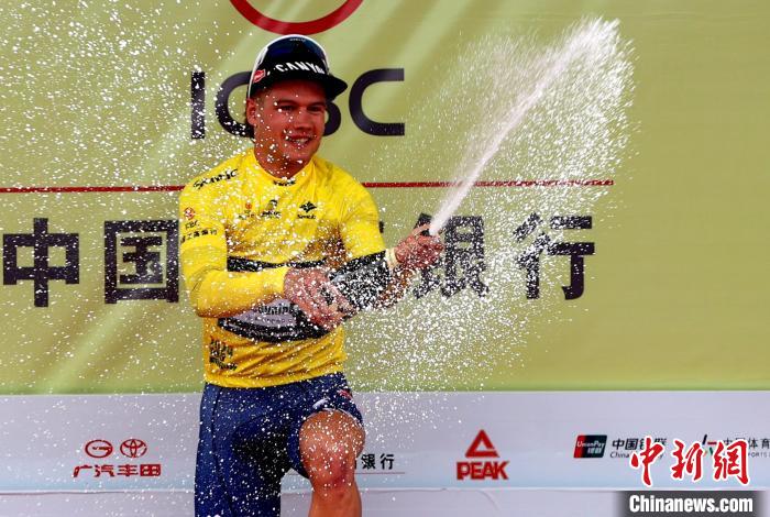 2024第二十三屆環(huán)青海湖國際公路自行車賽7月7日在青海省西寧市打響揭幕戰(zhàn),本賽段黃衫(個人成績第一名)獲得者比利時歐倍青-德科尼克車隊的14號延森-普羅萊特(PLOWRIGHT Jensen)在噴香檳慶祝。2024“中國工商銀行杯”第二十三屆環(huán)湖賽第一賽段西寧繞圈賽,比賽距離121公里(13.4公里/圈*9圈)共設(shè)三個途中沖刺點(第3、5、7圈)。兩個四級爬坡(24.7km處、51.5km處)。獲得本賽段前三名的是:第一名來自比利時歐倍青-德科尼克車隊的14號延森-普羅萊特(PLOWRIGHT Jensen),第二名來自意大利巴迪亞尼車隊67號恩里科-扎農(nóng)切洛(ZANONCELLO Enrico),第三名來自荷蘭帕克赫特爾車隊102號杰斯泊(RASCH Jesper )。中新社 記者 薛蒂 攝