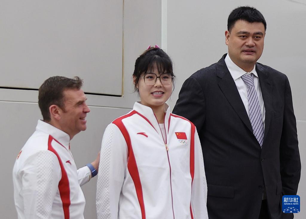 這是中國體育代表團成員姚明(右)與李月汝(中)在大會前。