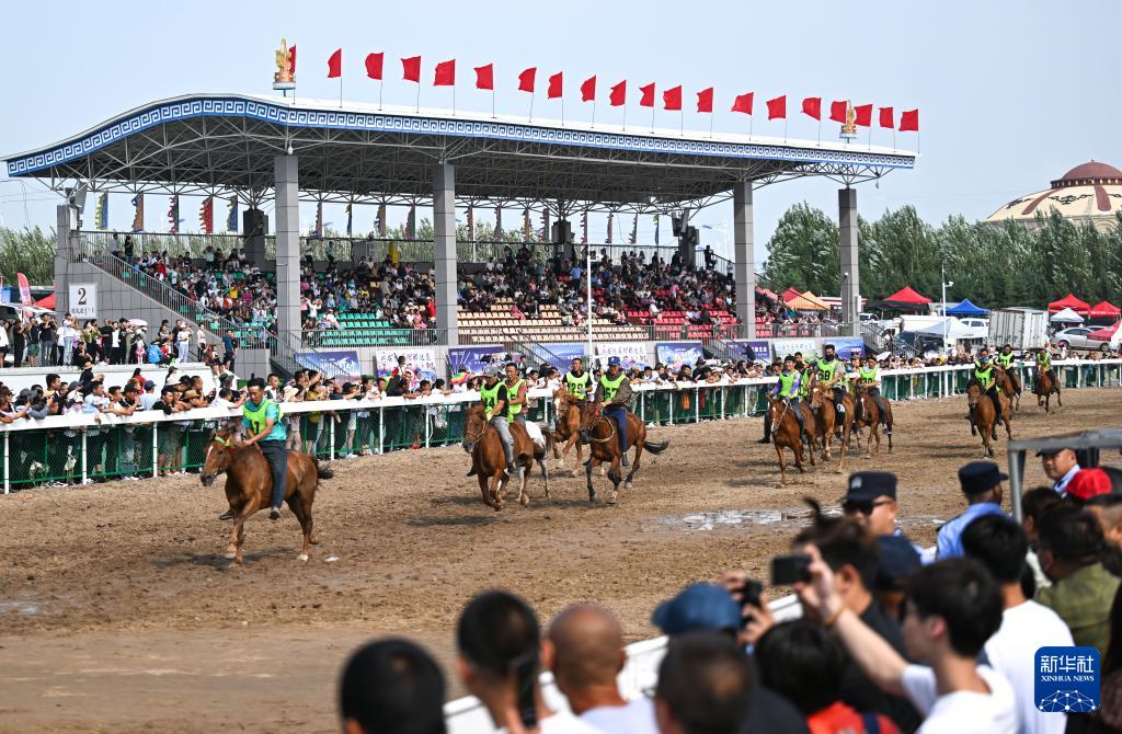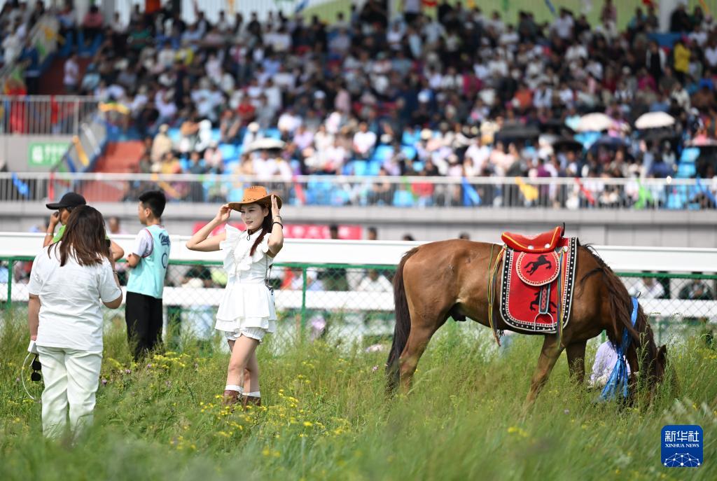 7月17日,游客在烏蘭毛都蘇木民族體育綜合訓練基地觀看賽馬比賽。
