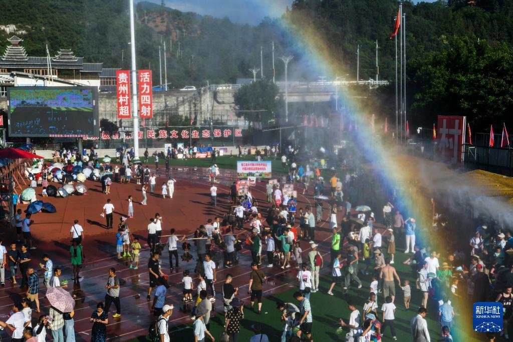 7月20日,2024年貴州“村超”總決賽現(xiàn)場噴霧降溫,形成一道彩虹。
