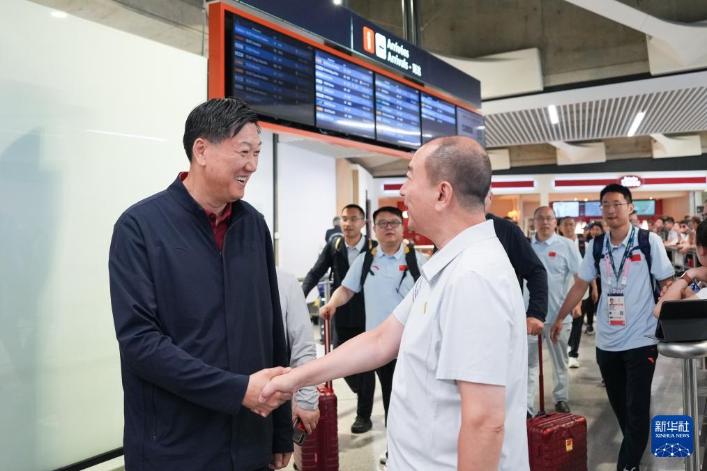 7月22日,國家體育總局局長、中國體育代表團團長高志丹(前左)抵達巴黎戴高樂機場后與工作人員握手。新華社記者 鞠煥宗 攝