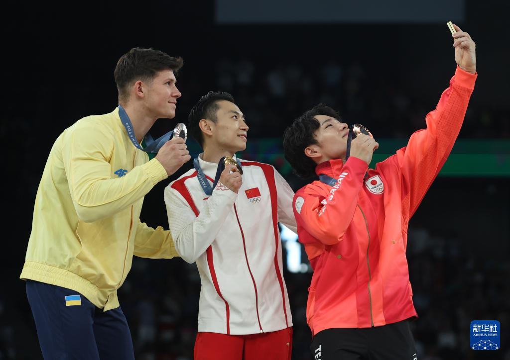 8月5日,冠軍中國選手鄒敬園(中)、亞軍烏克蘭選手伊利亞·科夫通(左)、季軍日本選手岡慎之助在頒獎儀式后合影。新華社記者 賴向東 攝
